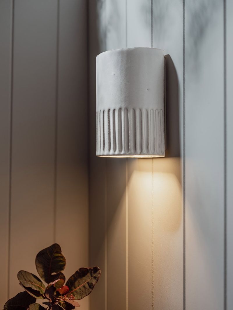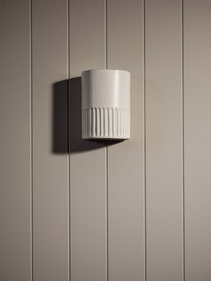 Add a pop of personality to your space with the stylish Day ceramic wall light, proudly made in Australia. This handcrafted piece brings warmth and ambiance to your room with its soft yet dynamic downward light and striking silhouette. The lower third features a playful corduroy pattern, expertly carved by hand to add texture to your walls. The smooth ceramic is coated in a low-sheen eggshell glaze for durability and elegance. It's mounted on a custom back plate that's nearly invisible, so it'll hug your wall snugly and complement any wall finish. To maintain consistency whilst preserving the handmade qualities, Day Short is slip cast into a mould. With a closed ceramic top, suitable for exterior installation.
