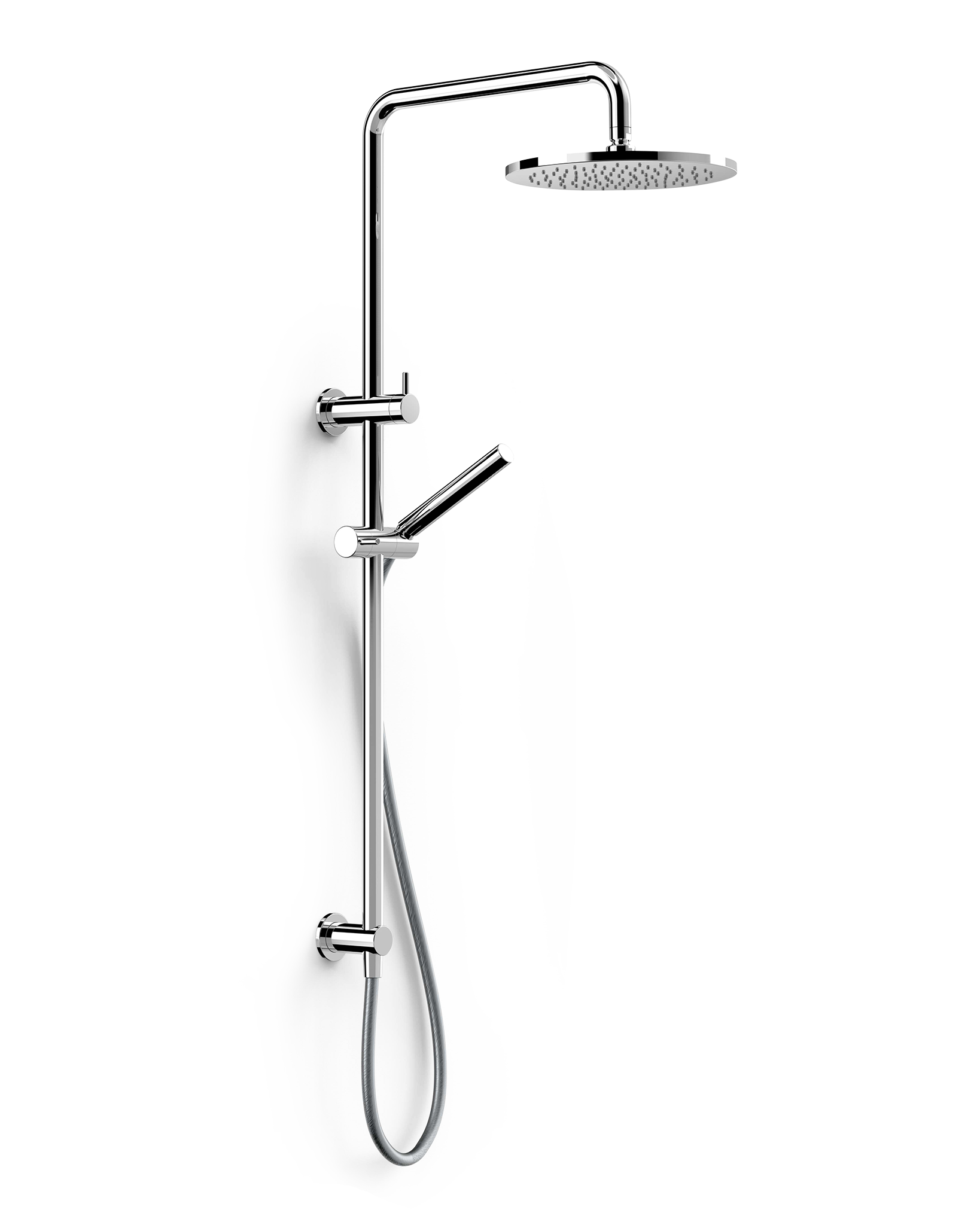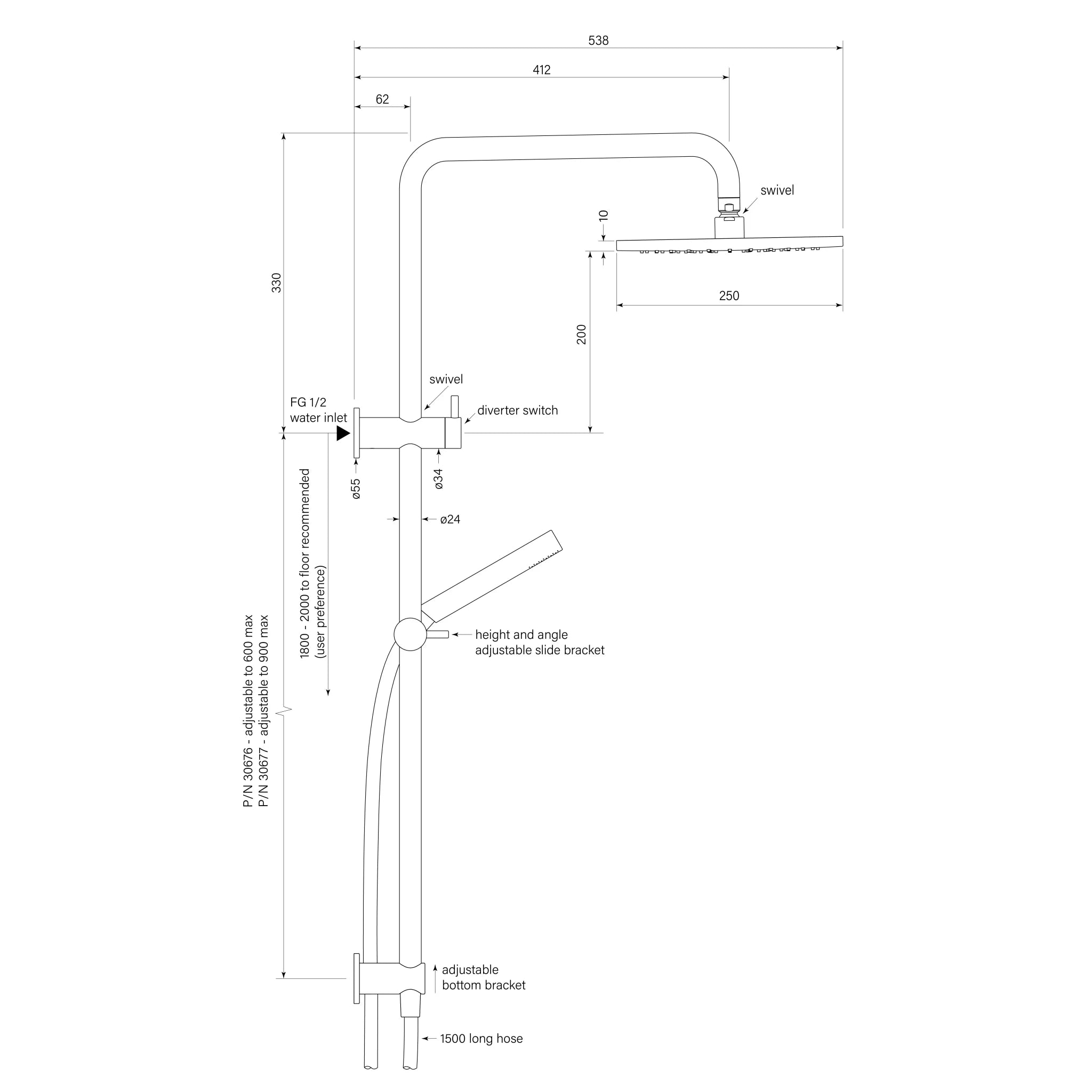 Pegasi dual shower with a micro hand shower, 412mm swivel arm, 250mm round head and 600mm rail length. Adjust the height and angle of your shower to suit your needs. Hose and hand shower is not available in a gloss finish. Custom arm height available