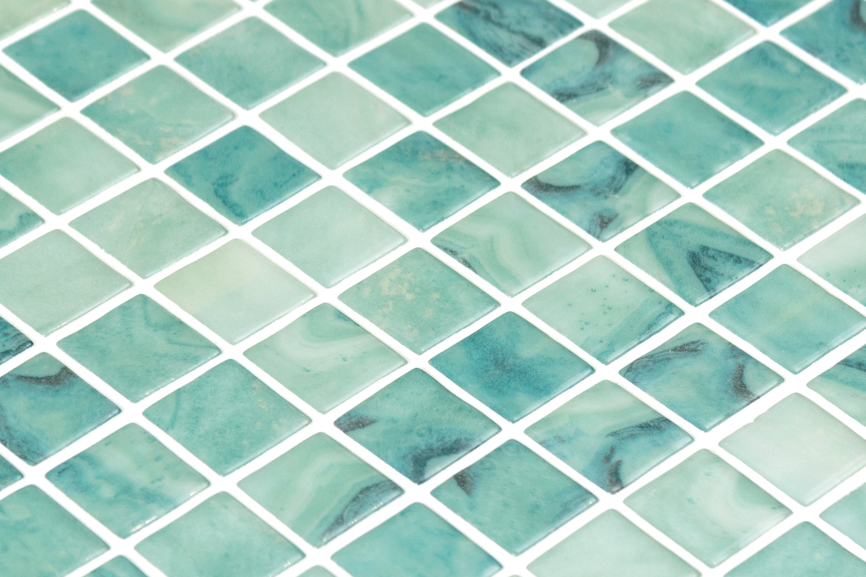The Lungomare glass mosaic is a mosaic of 25x25 mm square tiles, light green in colour and with a gloss finish, with an abstract design of sinuous lines. Ideal for pools that seek a design with personality.