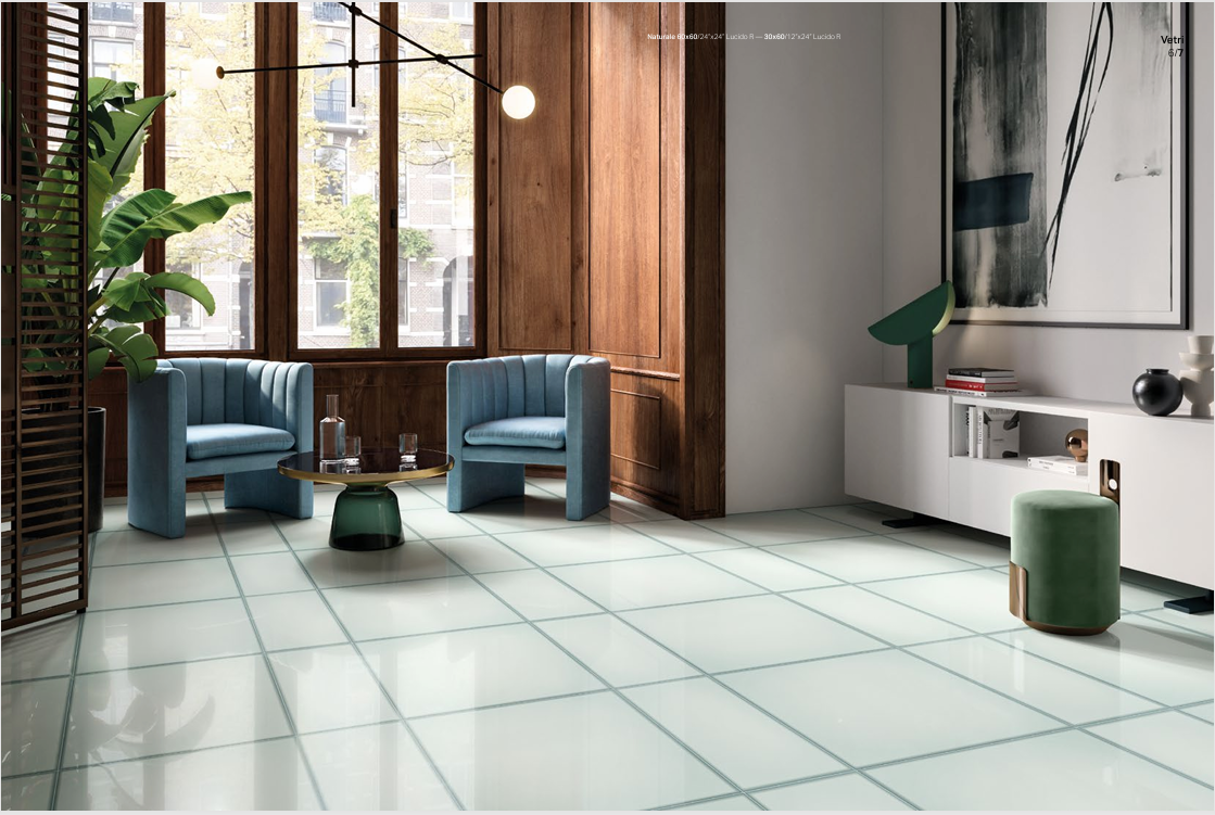 Glass is a material that offers intrinsic clarity and harmony, distinguished by its very own duplicity: transparent and matt, fragile and at the same time sturdy. A study of this material led to the creation of the Vetri ceramic tile collection: the delicate colour variations that mark the edges create a surface with an unprecedented depth and an elegant geometrical mesh. The glossy finishing reflects and emphasises light, lending its surroundings a brightness with evergreen charm.